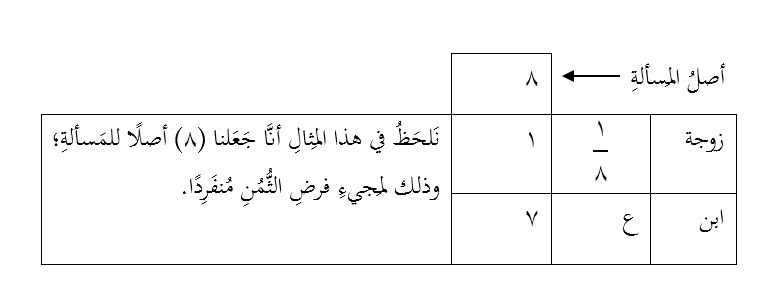 (1) توفِّيَ عَن زَوجةٍ، وابنٍ، فتُقسَمُ المَسألةُ على النَّحوِ الآتي: