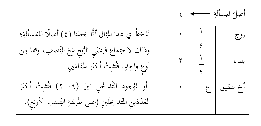 إذا كانَتِ الفُروضُ مُختَلِطةً مِن كِلا النَّوعَينِ فمَخرَجُها مِن أقَلِّ عَدَدٍ يَجمَعُها [286] إذا اختَلَطَ النِّصفُ بكُلِّ النَّوعِ الثَّاني أو ببَعضِه فالمَخرَجُ: 6 وإذا اختَلَطَ الرُّبعُ بكُلِّ النَّوعِ الثَّاني أو ببَعضِه فالمَخرَجُ: 12 وإذا اختَلَطَ الثُّمُنُ بكُلِّ النَّوعِ الثَّاني أو ببَعضِه فالمَخرَجُ: 24   .
