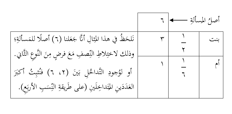(3) توفِّيَ عَن بنتٍ، وأُمٍّ، فتُقسَمُ المَسألةُ على النَّحوِ الآتي: