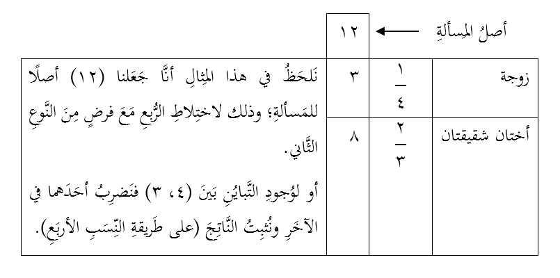 (4) توفِّيَ عَن زَوجةٍ، وأُختَينِ شَقيقَتَينِ، فتُقسَمُ المَسألةُ على النَّحوِ الآتي: