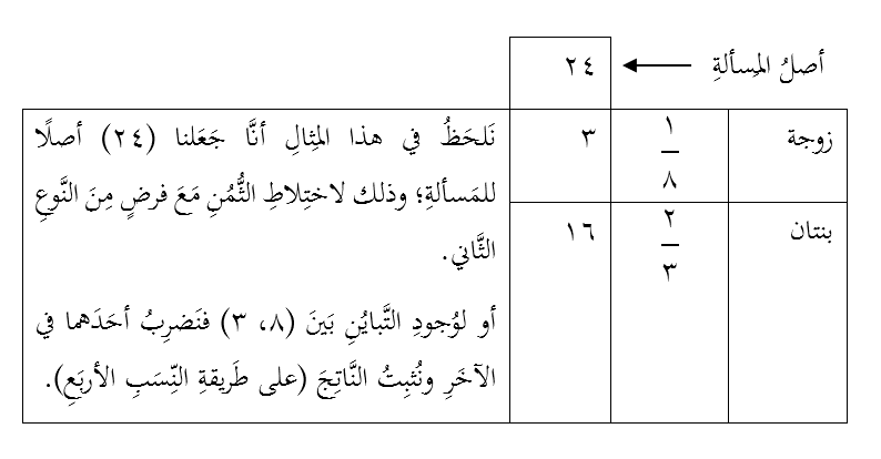(5) توفِّيَ عَن زَوجةٍ، وبِنتَينِ، فتُقسَمُ المَسألةُ على النَّحوِ الآتي:
