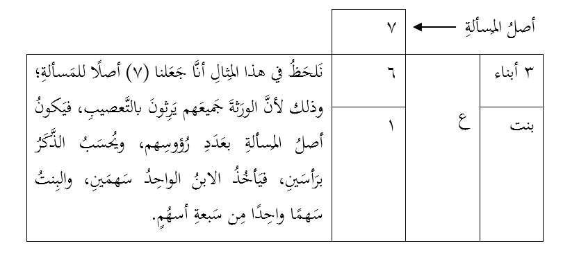 (6) توفِّيَ عَن ثَلاثةِ أبناءٍ، وبِنتٍ، فتُقسَمُ المَسألةُ على النَّحوِ الآتي: