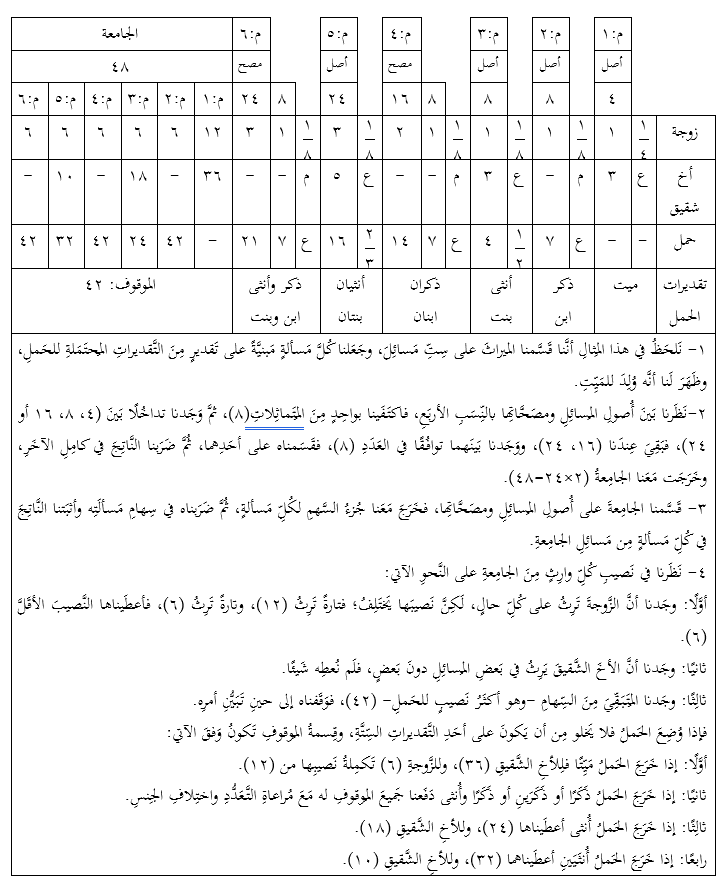5- نُقارِنُ بَينَ نَصيبِ الورَثةِ في المَسائِلِ السِّتِّ مِنَ الجامِعةِ، فمَن كانَ وارِثًا على كُلِّ تَقديرٍ ونَصيبُه لا يَختَلِفُ، أخَذَ نَصيبَه كامِلًا، ومَن يَختَلِفُ نَصيبُه نُعطيه الأقَلَّ، ومَن يَرِثُ في مَسألةٍ دونَ أُخرى فلا نُعطيه شَيئًا، ونوقِفُ الباقيَ لحينِ وضعِ الحَملِ وتَبَيُّنِ الحالِ.
